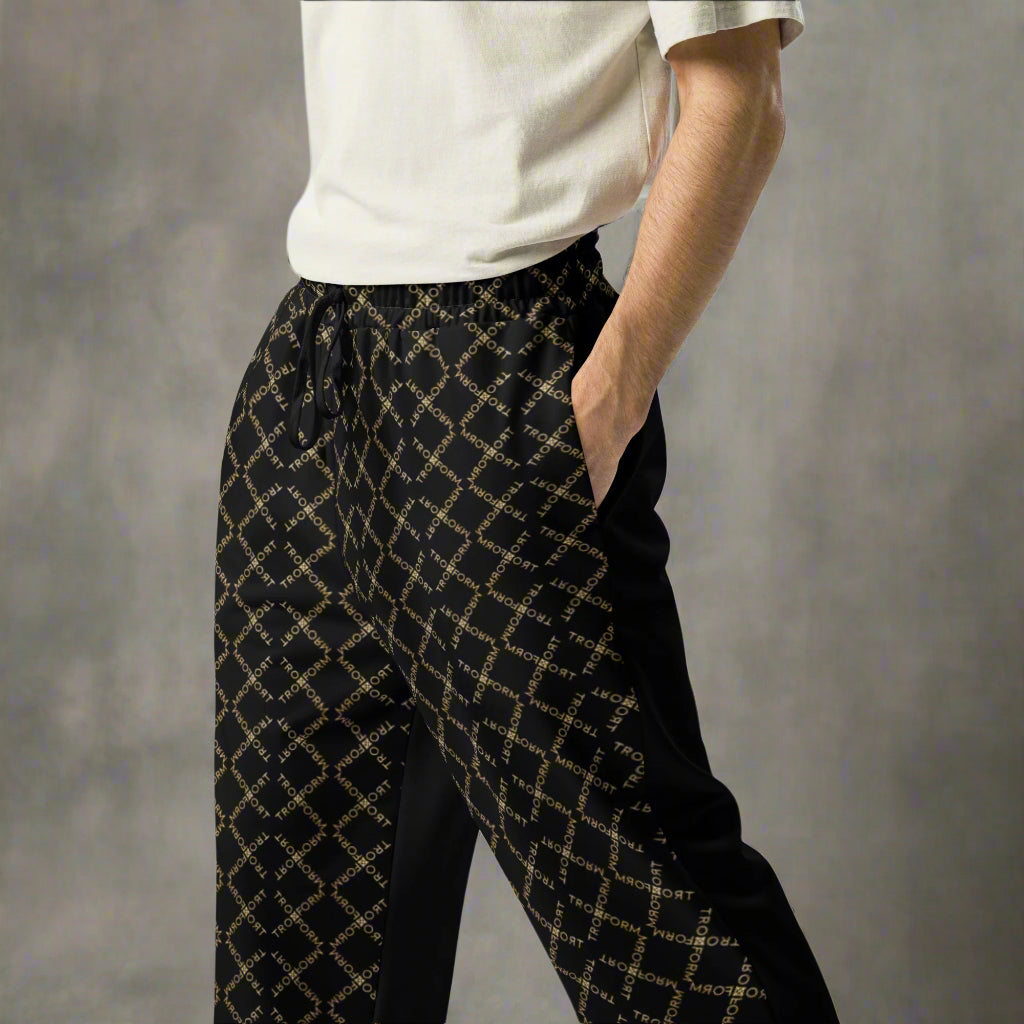 Crafted with a refined wide-leg silhouette inspired by '90s street prestige and elevated through TRONFORM’s futuristic Iconic X TF monogram grid, these pants evoke both power and poise. Whether strolling a sunlit boulevard or posing beside your other half for a sharp editorial look, this piece moves with you and beside the one who mirrors your energy.