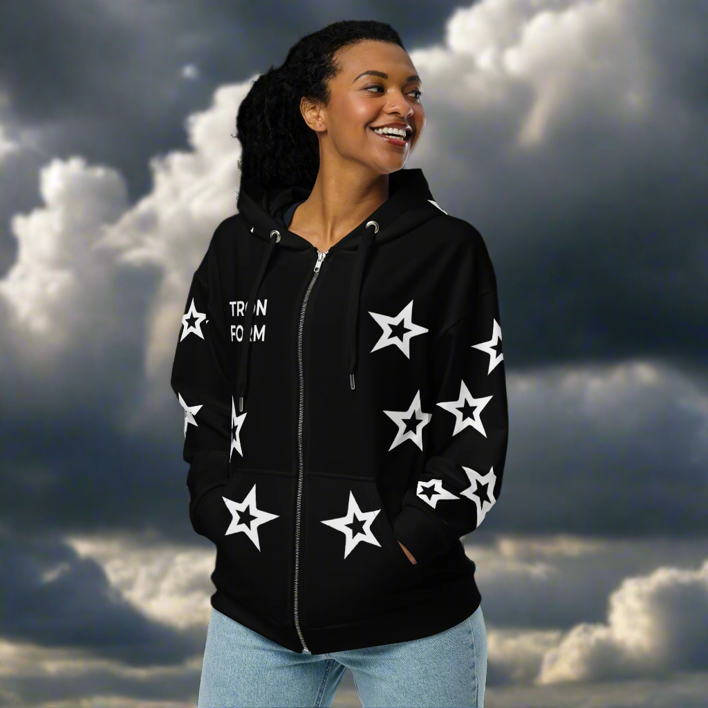 The Women’s Starflow Halo TRONFORM Zip Hoodie is the ultimate fusion of comfort, elegance, and futuristic energy. Designed with TRONFORM’s signature Starflow Halo detailing, this hoodie turns casualwear into a bold fashion statement. The relaxed drop-shoulder fit and double-lined hood wrap you in structured softness—perfect for off-duty power or laid-back confidence.